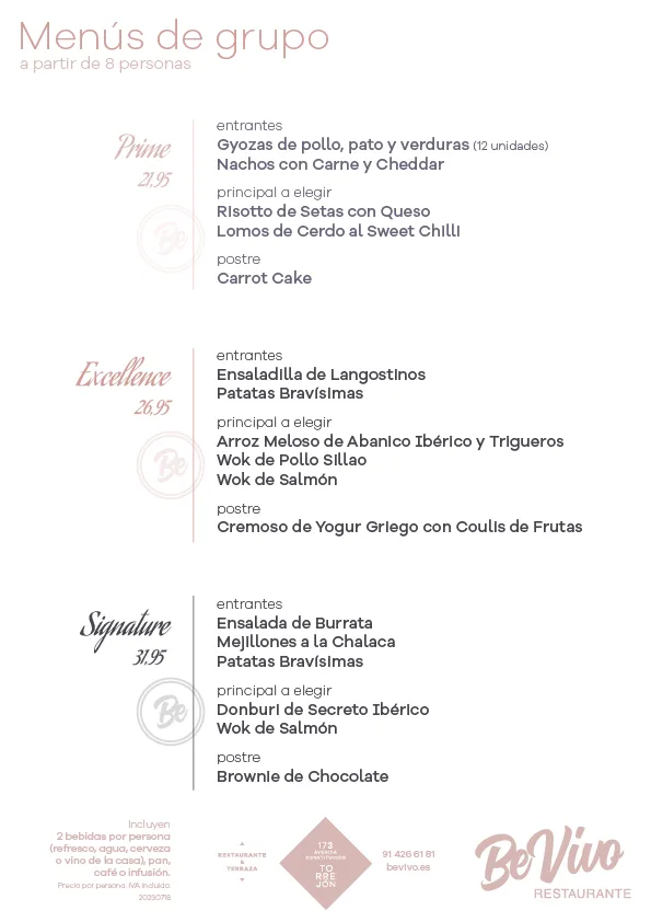 Pan, café o infusión, dos bebidas por persona (cerveza, agua o vinos de la casa) o refresco refill